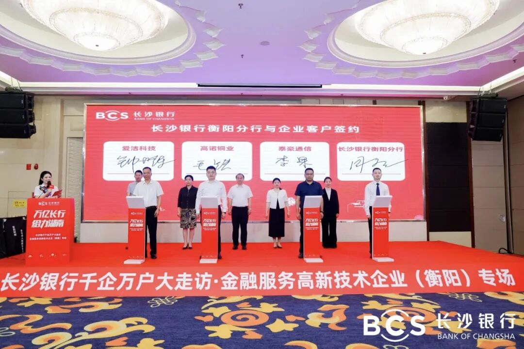 会上,长沙银行与衡阳市政府签署合作协议;长沙银行衡阳分行与高诺(衡阳)铜业有限责任公司、衡阳泰豪通信车辆有限公司、衡阳爱洁科技股份有限公司等企业签约。会后,与会代表还走访调研泰豪通信、衡阳市高新投资集团等企业,实地了解高新技术企业发展情况与融资需求。